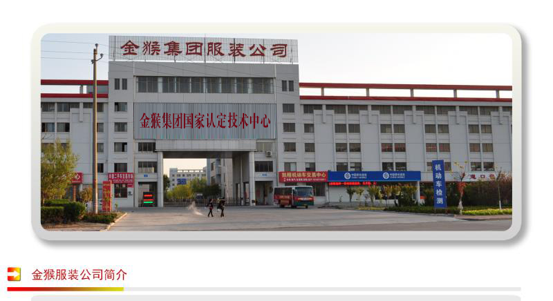 ★金猴集團服裝有限公司始建于1965年,系金猴集團的控股子公司,山東省的服裝生產(chǎn)企業(yè)之一。公司占地130畝,擁有各種專業(yè)設(shè)備1000多臺(套),主要生產(chǎn)羽絨服、滑雪衫、摩托服、防寒服、休閑服、運動套裝、襯衣、西褲等產(chǎn)品,主要出口韓國、日本、俄羅斯、美國、墨西哥、奧地利、德國、意大利等國家?!敖鸷锱啤狈b于1997年通過ISO9002質(zhì)量認證,被國家進出口檢驗檢疫局授予“出口商品重質(zhì)量守信譽單位”。